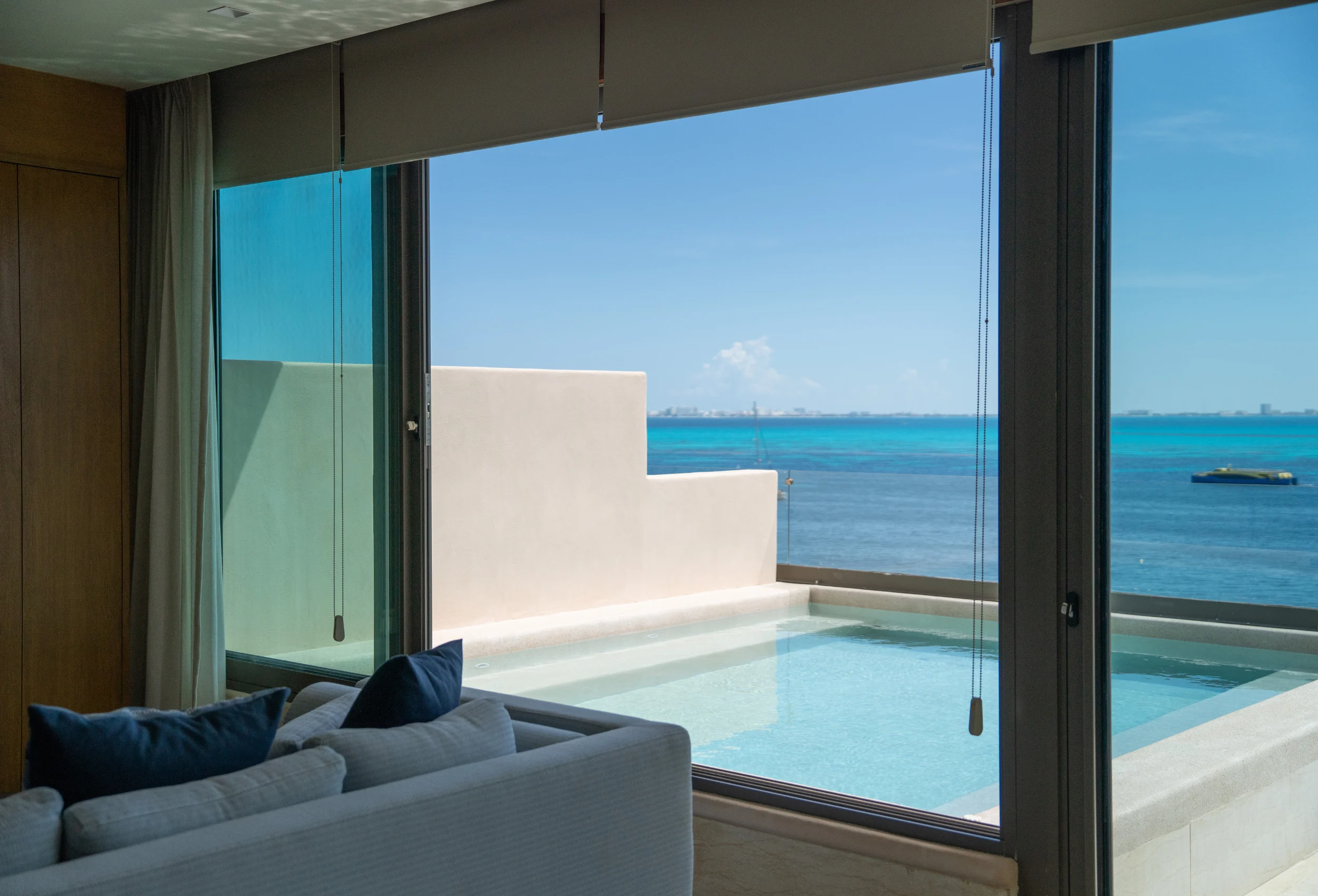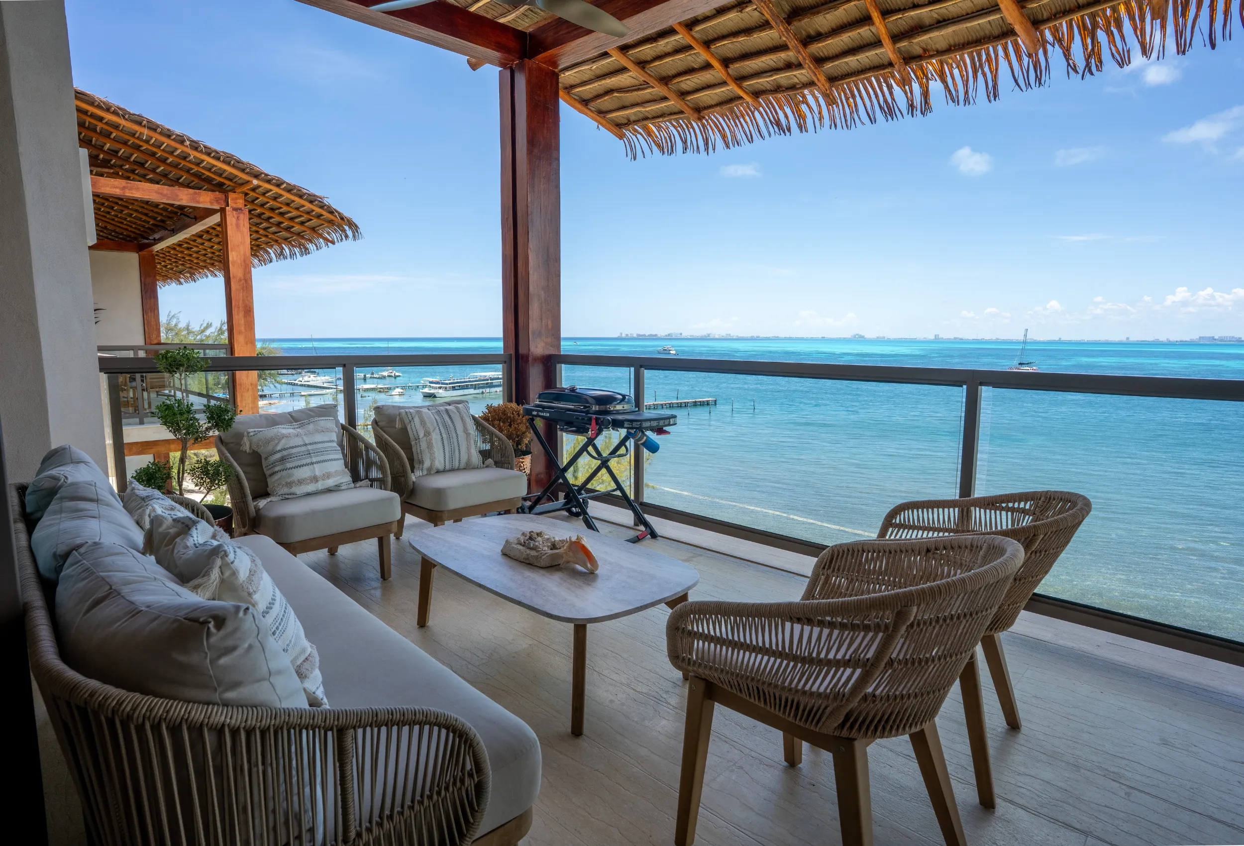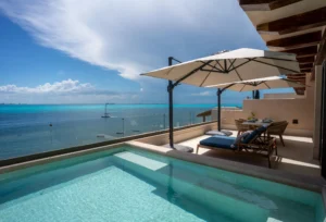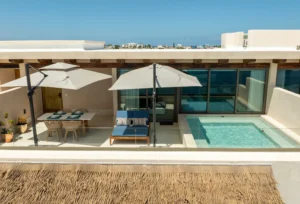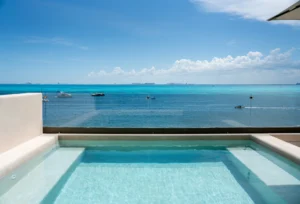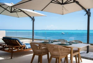 Está ubicado en un exclusivo complejo residencial en Isla Mujeres con más de 70 metros lineales de frente de playa, impresionantes áreas comunes como una alberca infinita climatizada y una increíble terraza con área lounge, bar de cocktails y más.